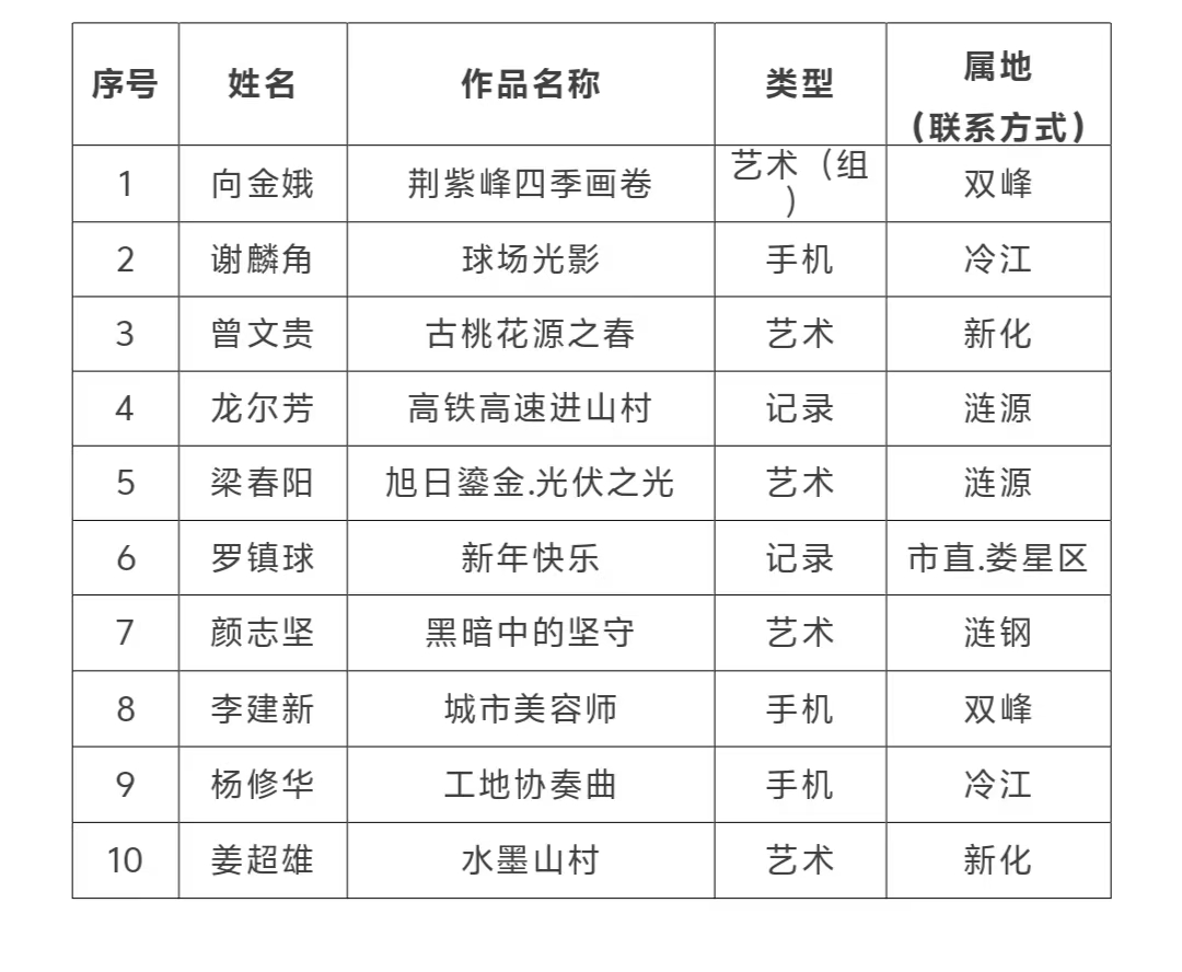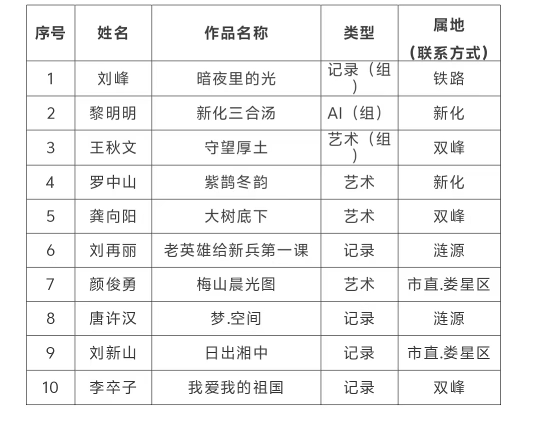 根据2025首届娄底文化艺术季第一届娄底市摄影艺术展评审方案的要求,展览组委会于8月10日对参与第一届娄底市摄影艺术展的所有投稿作品进行了公开、公正的评审,评选出了娄底摄影奖优秀奖作品10件;娄底摄影奖提名奖作品10件。现对评审结果予以公示,公示期为5天(8月15—8月21日)如有异议,请向展览组委会举报。